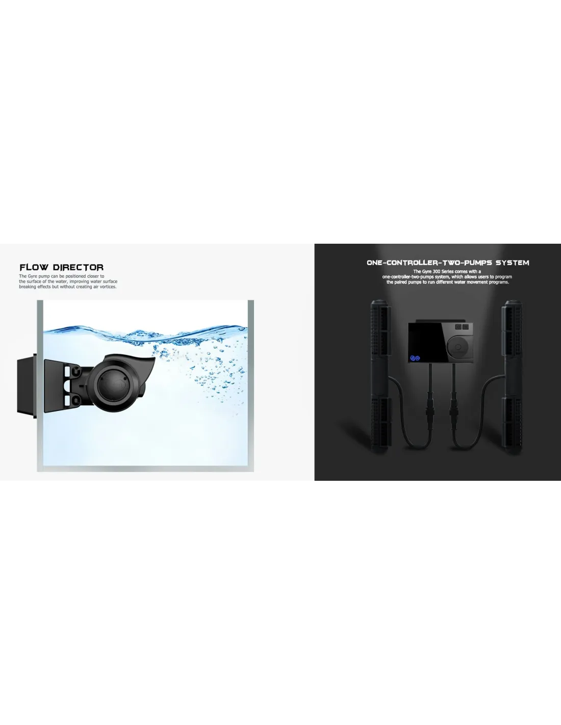 La tecnologia a flusso incrociato permette ad una sola Gyre di spostare l'intera colonna d'acqua nell'acquario eliminando la necessità delle pompe aggiuntive. Grazie a ciò si riduce la produzione del calore e la necessità di equipaggiamento extra in modo da potersi concentrare sui pesci e coralli. Modificando il verso in cui gira di una delle due pale ed impostando la modalità con una sola pompa si otterrà un flusso alternato nell'acquario. Ciò rende la Gyre la più versatile delle pompe presenti sul mercato.